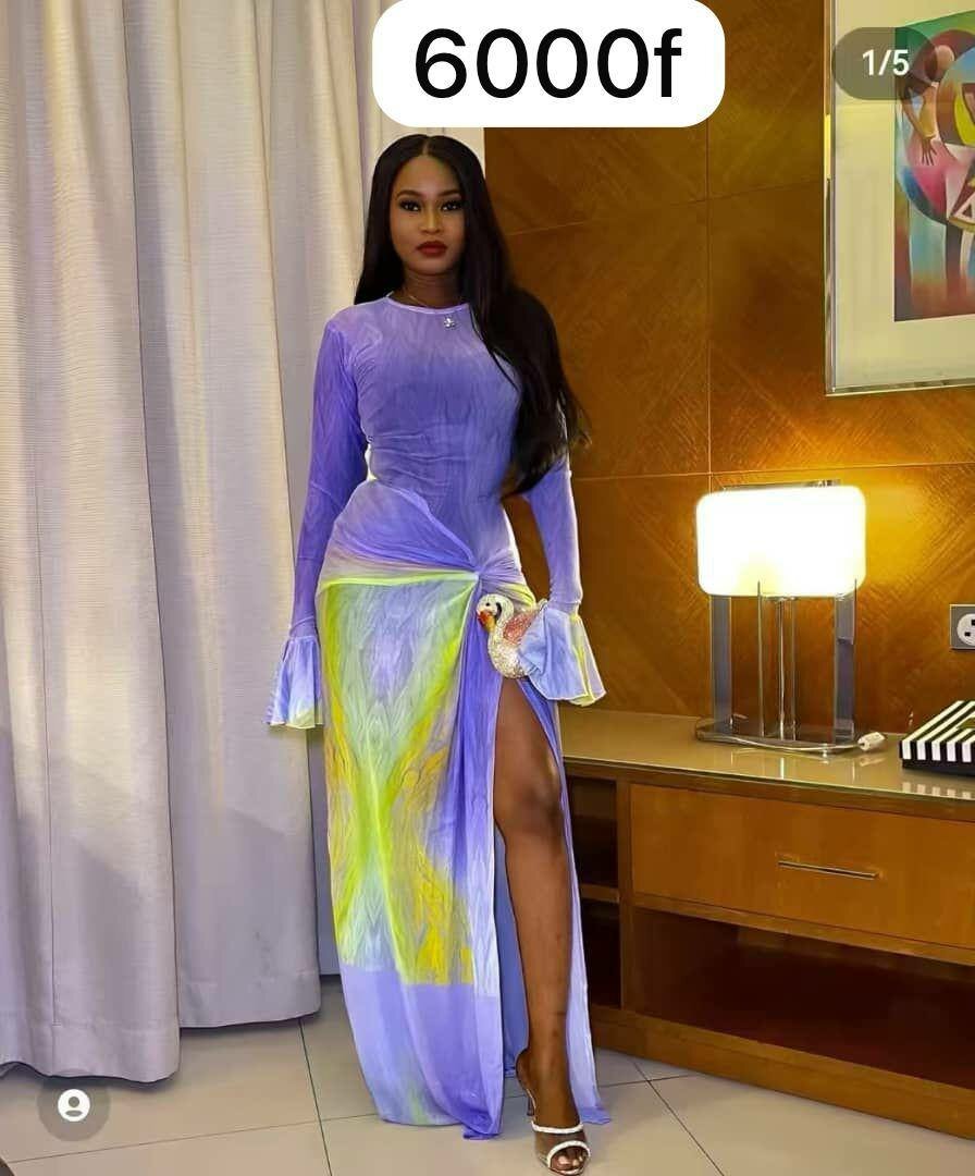 Cette robe longue élégante combine un tissu violet doux avec des touches de vert flamboyant. Son design à fente haute et manches évasées met en valeur le style moderne et chic. Idéale pour les événements spéciaux, cette tenue offre une allure raffinée et audacieuse, parfaite pour celles qui cherchent à se démarquer avec élégance.