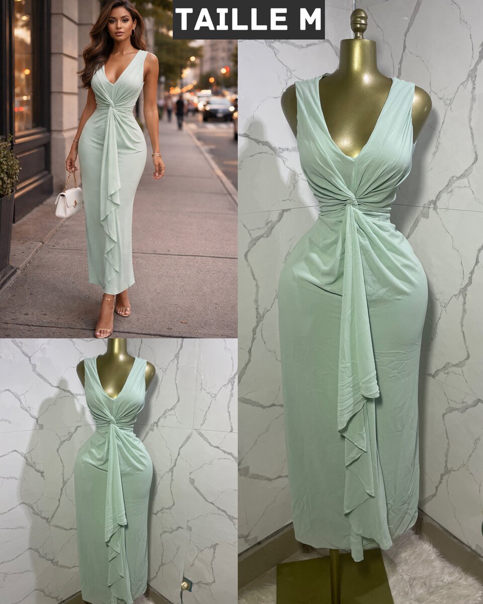 Sublime robe longue verte pour occasions spéciales. Conception élégante avec un décolleté flatteur et drapé fluide. Idéale pour soirées ou événements chic. Disponible en taille M pour un look sophistiqué et moderne.