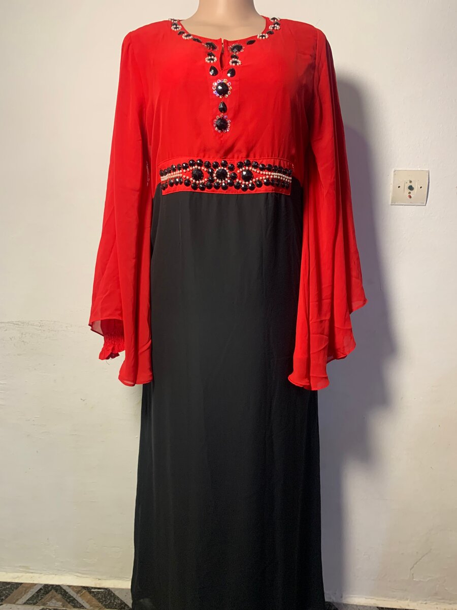 Découvrez cette somptueuse robe rouge et noire, parfaite pour les occasions spéciales. Fabriquée avec soin, elle met en valeur votre silhouette et offre un confort optimal grâce à son tissu léger. L'élégance des détails brodés et la fluidité des manches ajoutent une touche sophistiquée à votre tenue. Idéale pour les soirées, mariages ou événements formels.