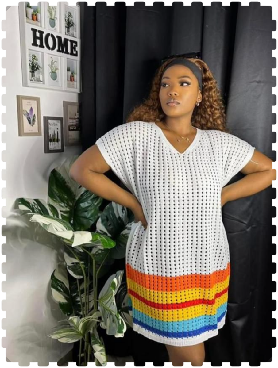 Optez pour cette robe en crochet avec motif arc-en-ciel. Parfaite pour l'été, elle offre confort et style unique. Idéale pour les sorties décontractées ou la plage.