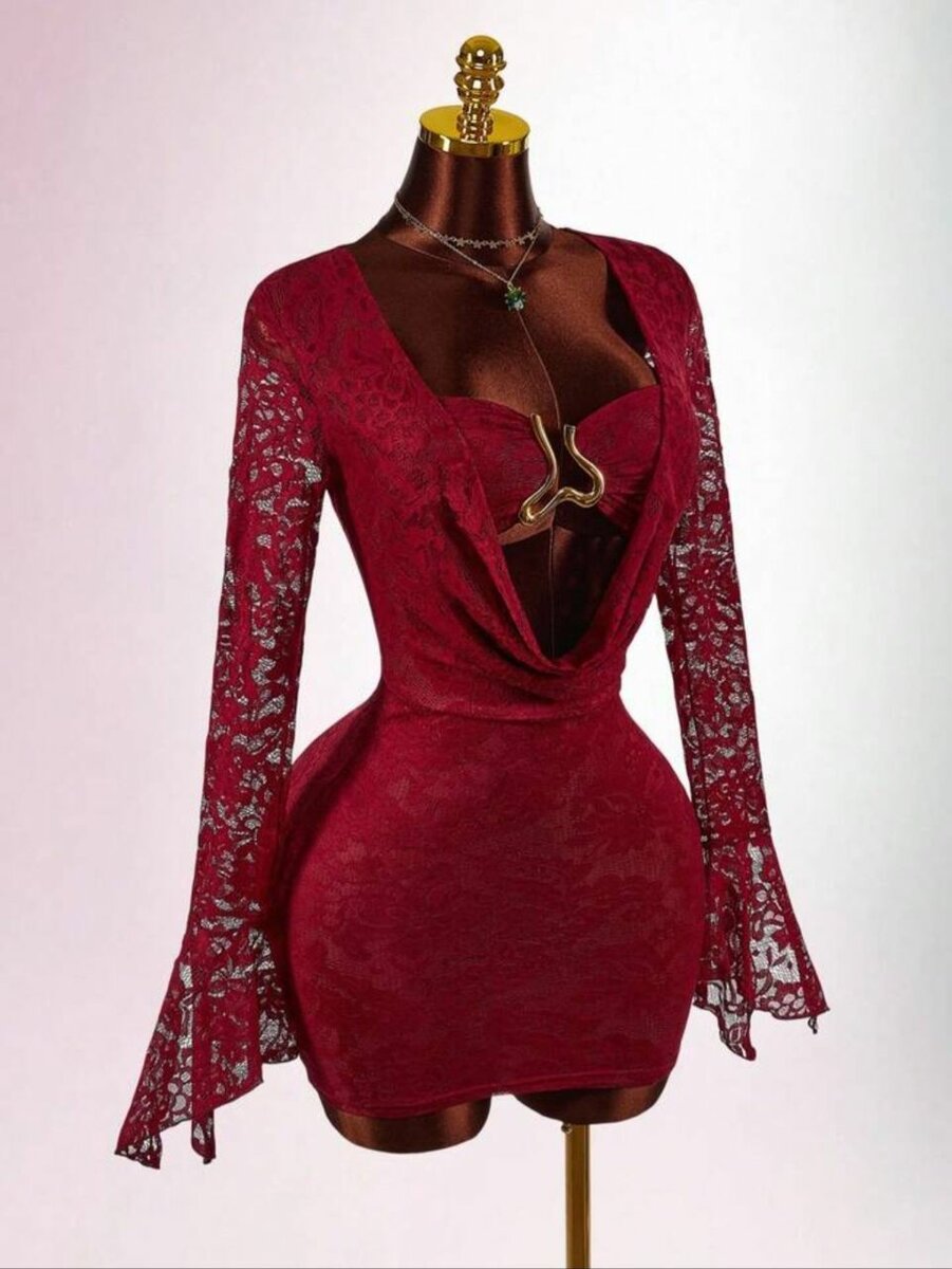 Élégante robe en dentelle bordeaux, parfaite pour les soirées spéciales. Offrant une coupe ajustée et des manches évasées, elle est idéale pour mettre en valeur votre silhouette. Son décolleté plongeant avec détails séduisants la rend unique. Parfaite pour un look chic et audacieux en toute occasion.