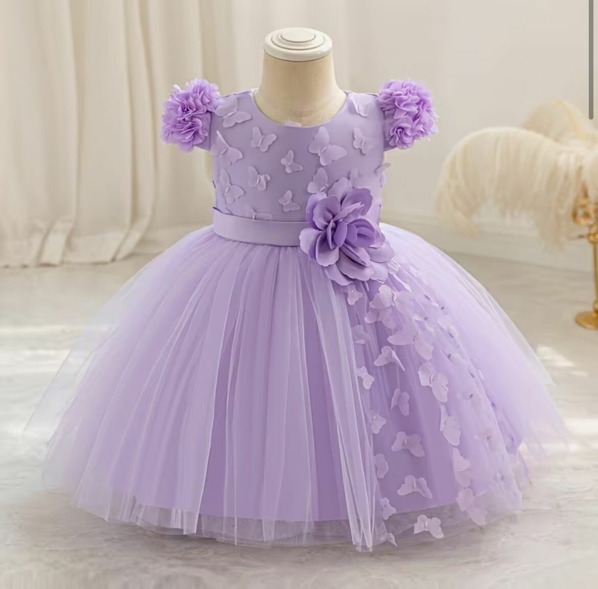Enchantante robe de fête en tulle lavande pour fillettes. Parfaite pour mariages, anniversaires et événements spéciaux. Décorée de fleurs délicates et d'un élégant nœud, elle assure une allure princesse.