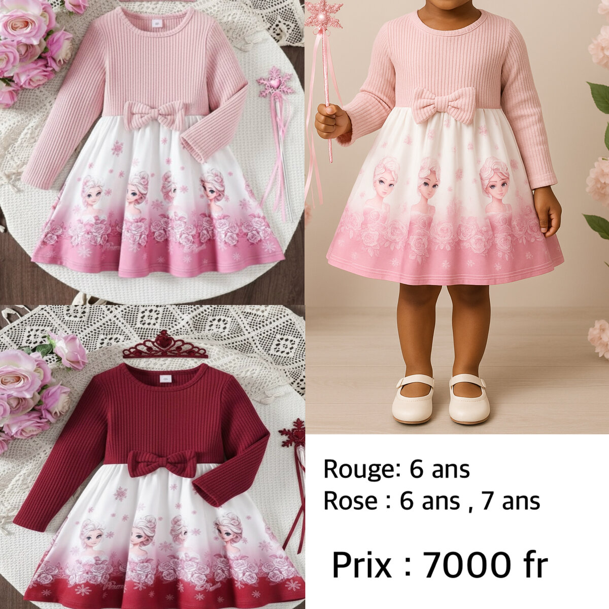 Adorable robe pour enfant avec imprimé floral et nœud élégant. Idéale pour les cérémonies ou occasions spéciales. Disponible en rouge et rose. Confort et style assuré pour les petites princesses.