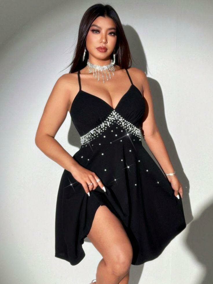 Éclairez vos soirées avec cette élégante robe évasée noire ornée de strass scintillants. Sa coupe flatteuse et ses bretelles fines offrent confort et style, parfaites pour toutes vos occasions spéciales. Un choix idéal pour se démarquer et briller.