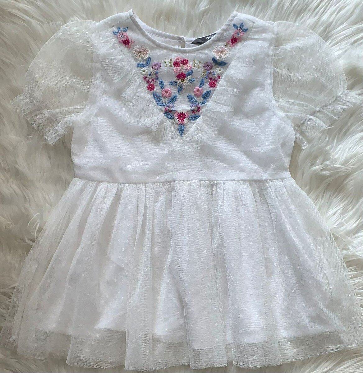 Cette robe blanche pour fille est ornée de broderies florales délicates et de manches en tulle transparent. Idéale pour des occasions spéciales ou des cérémonies, elle ajoutera une touche de douceur et d'élégance à toute garde-robe.