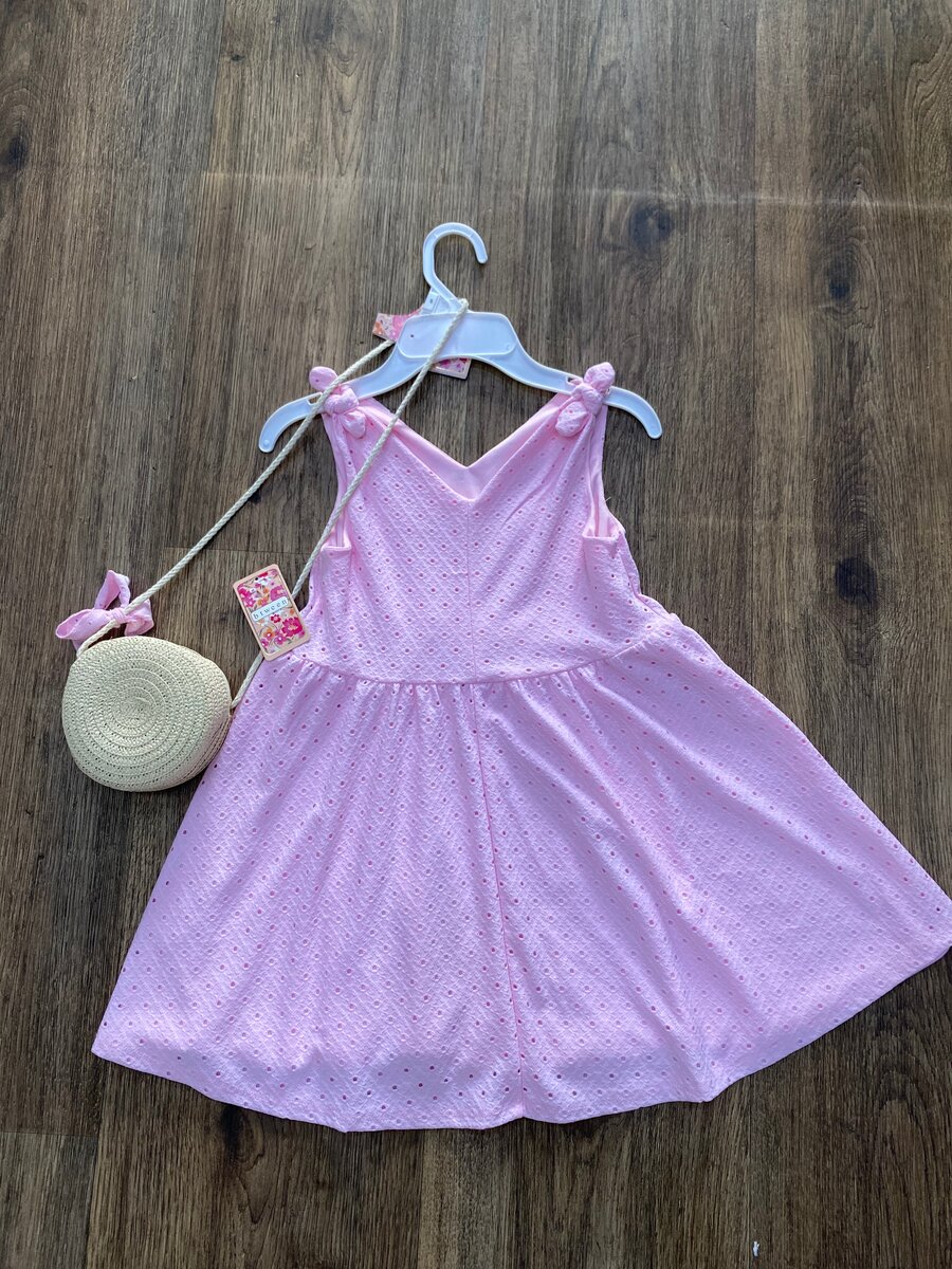 Une robe d'été rose pour fille, parfaite pour les journées ensoleillées. Avec des bretelles à nouer et un style léger, elle garantit confort et élégance. Accompagnée d'un sac assorti, c'est le choix idéal pour les sorties estivales.