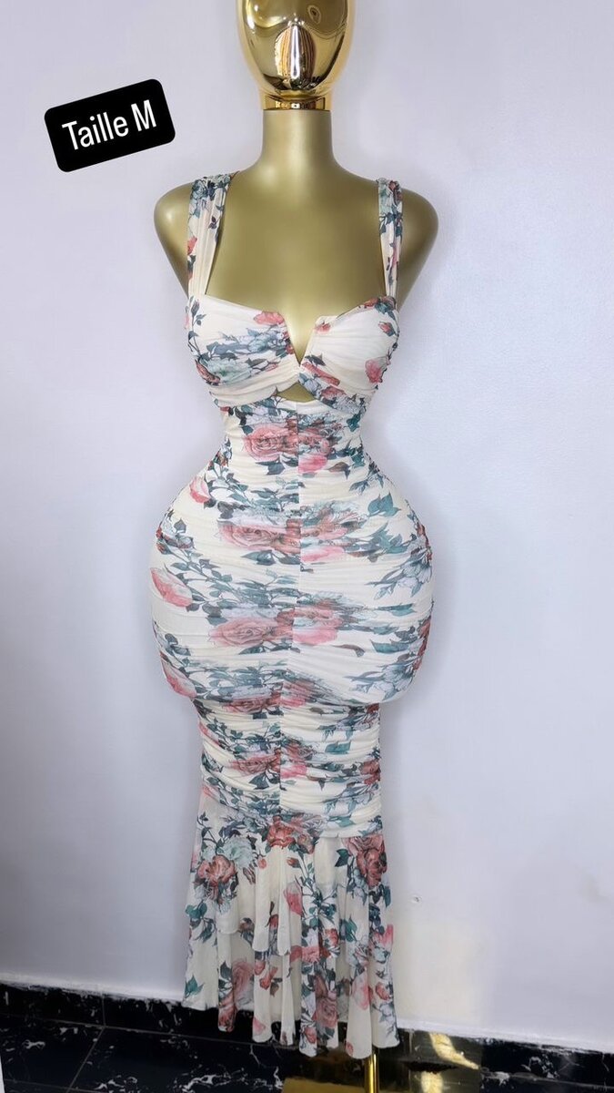 Robe féminine fleurie avec jupe froncée, parfaite pour une soirée élégante. Conception moulante qui met en valeur votre silhouette.