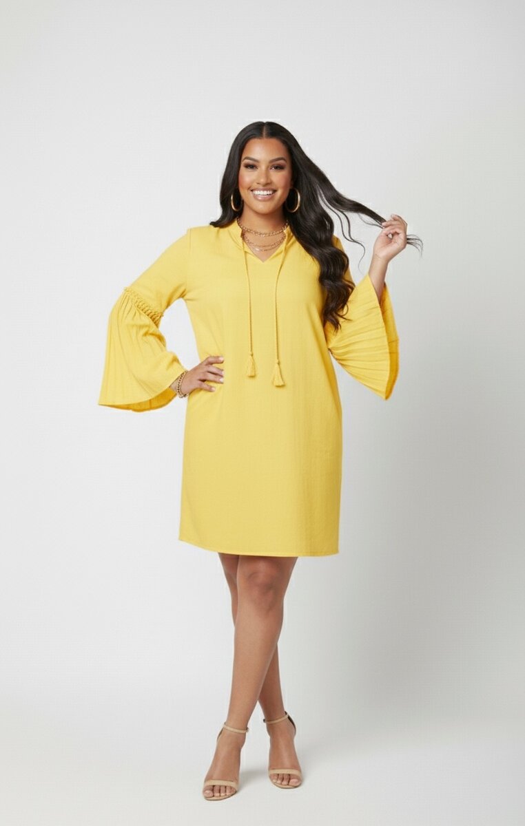 Robe courte élégante en jaune vif, idéale pour illuminer votre tenue. Conçue avec des manches évasées distinctives, elle allie style et confort. Parfaite pour les occasions décontractées ou une sortie estivale. Faites tourner les regards avec cette pièce mode incontournable.