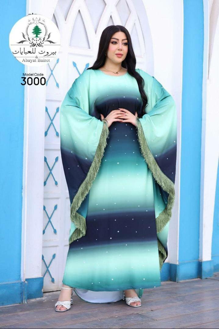 Élégant kaftan émeraude pour femme, idéal pour des occasions spéciales. Tissu fluide avec détails brillants et franges décoratives. Confort et style assurés, parfait pour une allure sophistiquée.