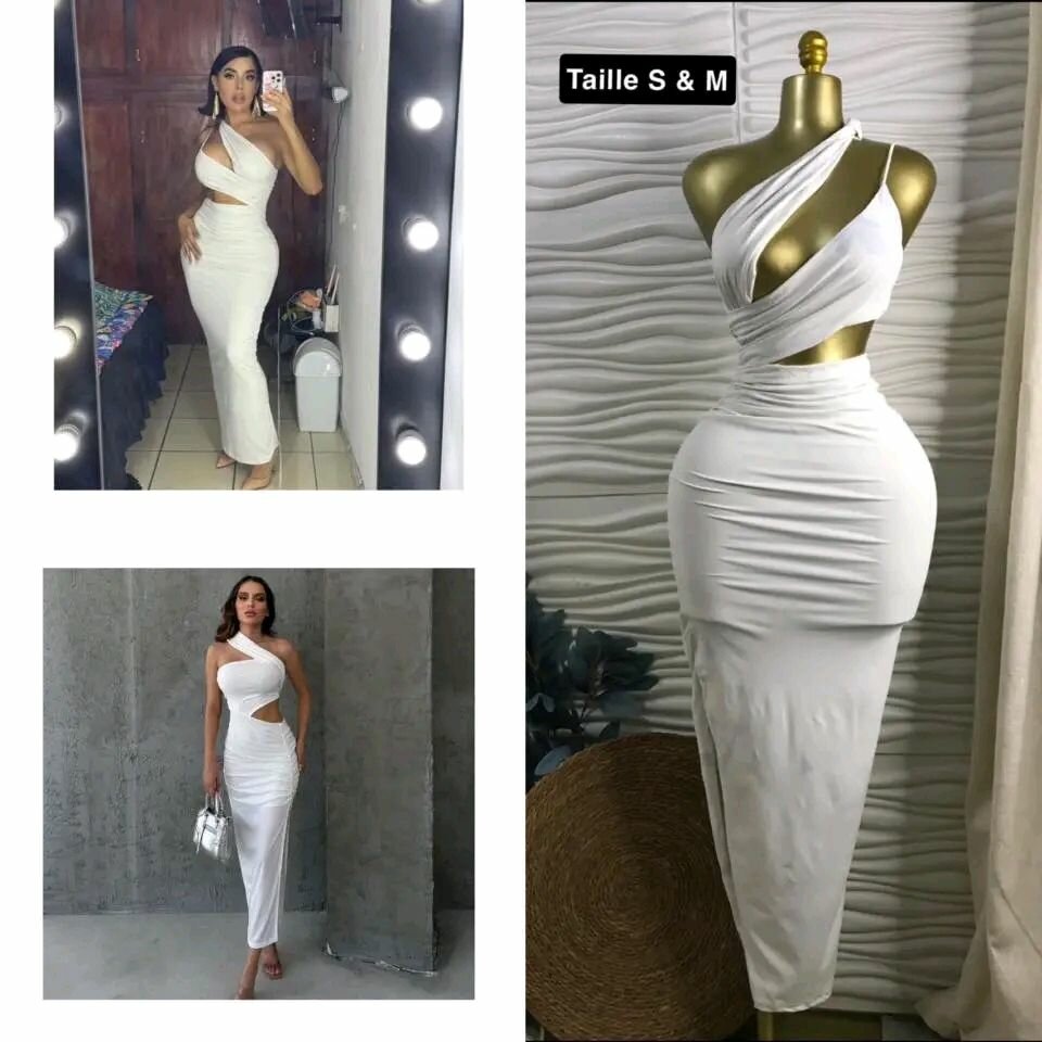 Élégante robe longue blanche à bretelles asymétriques, idéale pour soirées et événements spéciaux. Disponible en tailles S & M. Tissu confortable et coupe ajustée pour un look sophistiqué.