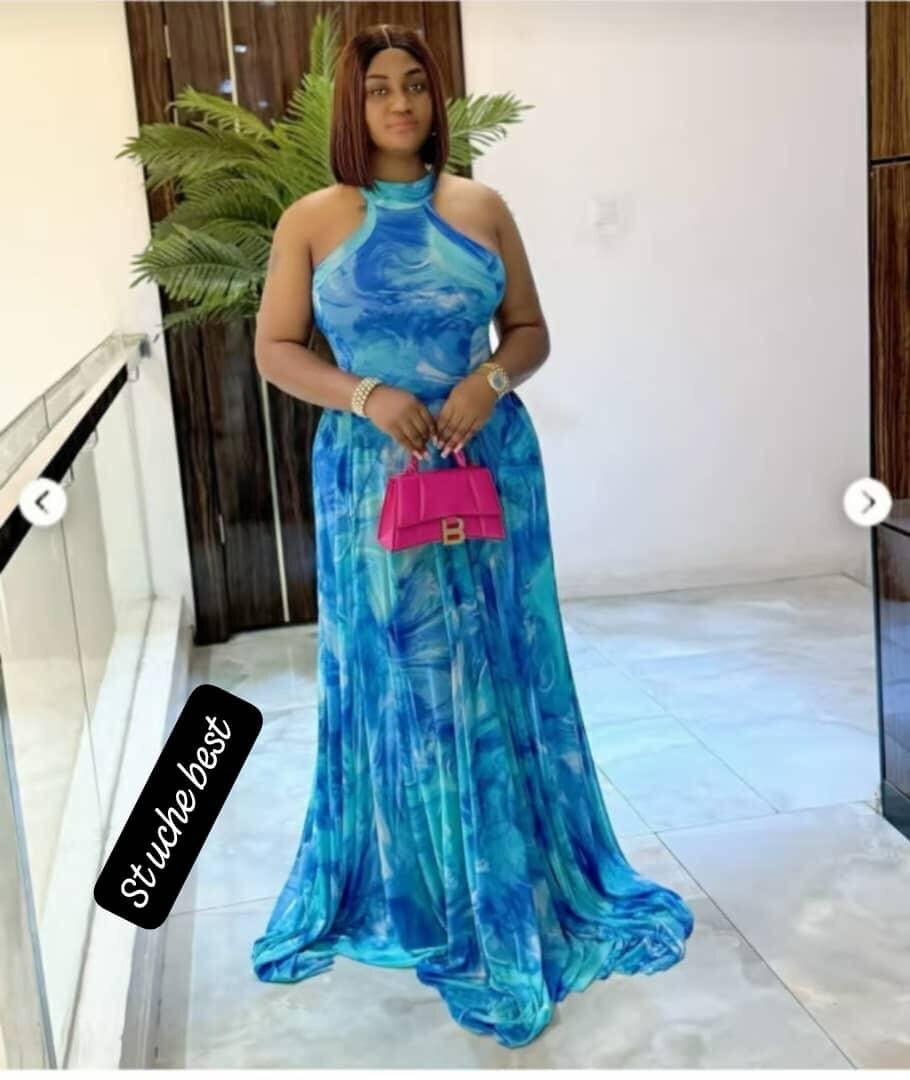 Robe longue bleue avec motif artistique et design sans manches. Parfaite pour des événements spéciaux ou soirées élégantes. Tissu fluide pour un confort maximal, offrant une allure sophistiquée et chic.
