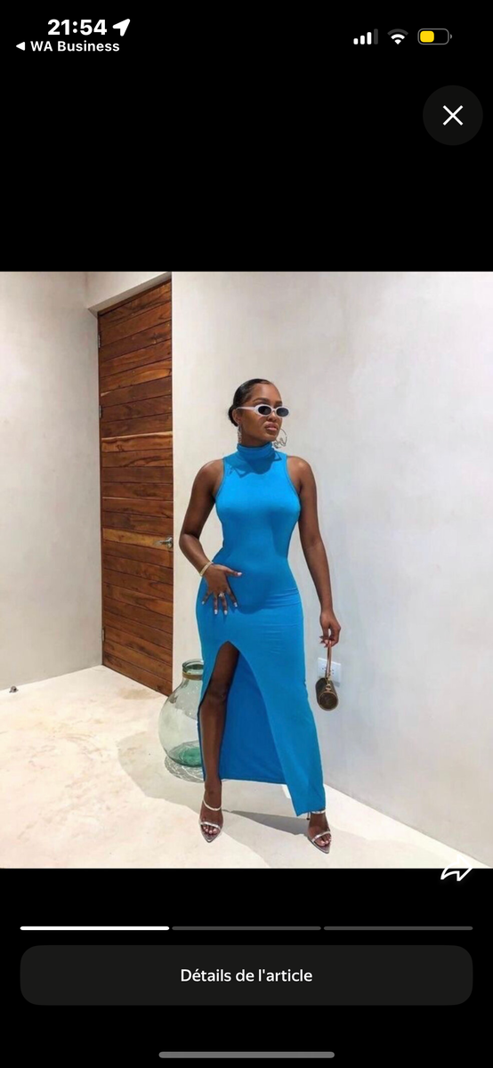 Optez pour cette robe longue bleu captivante, idéale pour les occasions spéciales. Avec sa coupe ajustée et son élégante fente, elle souligne votre silhouette. Parfaite pour une soirée d'été ou un événement formel, elle allie confort et style avec son tissu léger et sa conception sans manches. Faites sensation et affirmez votre style avec cette pièce incontournable.