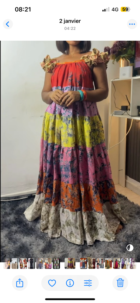 Optez pour cette élégante robe longue bohème aux multiples couleurs vibrantes. Parfaite pour les soirées estivales ou les événements décontractés, elle souligne votre silhouette avec son tissu fluide et ses volants délicats. Faites tourner les têtes avec ce vêtement unique et stylé!