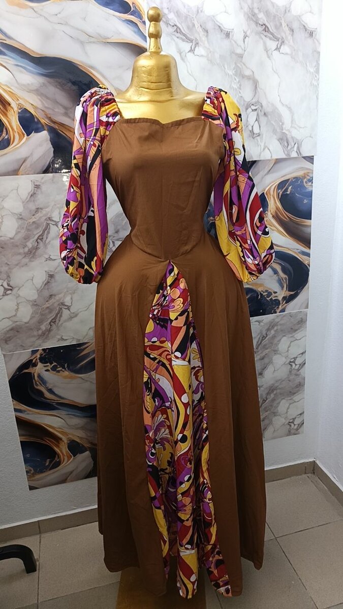 Découvrez cette magnifique robe longue au style bohème, ornée de motifs colorés sur les manches et la jupe. Idéale pour des occasions spéciales, elle allie élégance et confort grâce à sa coupe flatteuse. Parfait pour les soirées d'été et les événements artistiques.