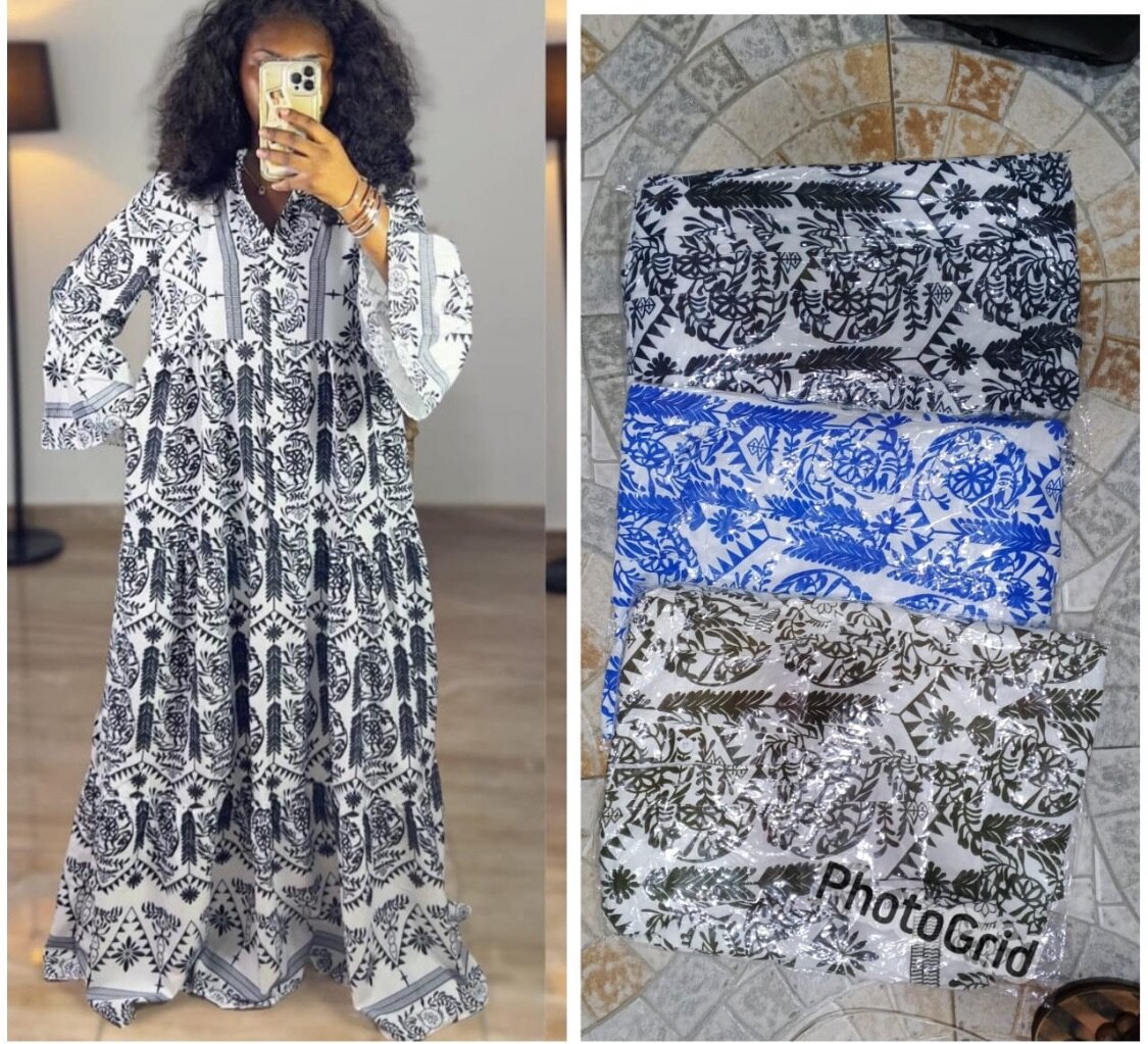 Élégante robe longue avec motifs bohèmes, idéale pour une tenue décontractée ou estivale. Disponible en plusieurs couleurs vives.