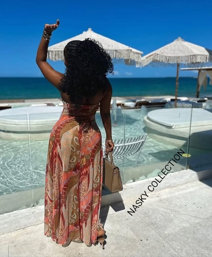 Élégante robe longue bohème pour femme, idéale pour la plage. Tissu léger et motifs colorés parfaits pour l'été. Parfaite pour des vacances stylées au bord de la mer.