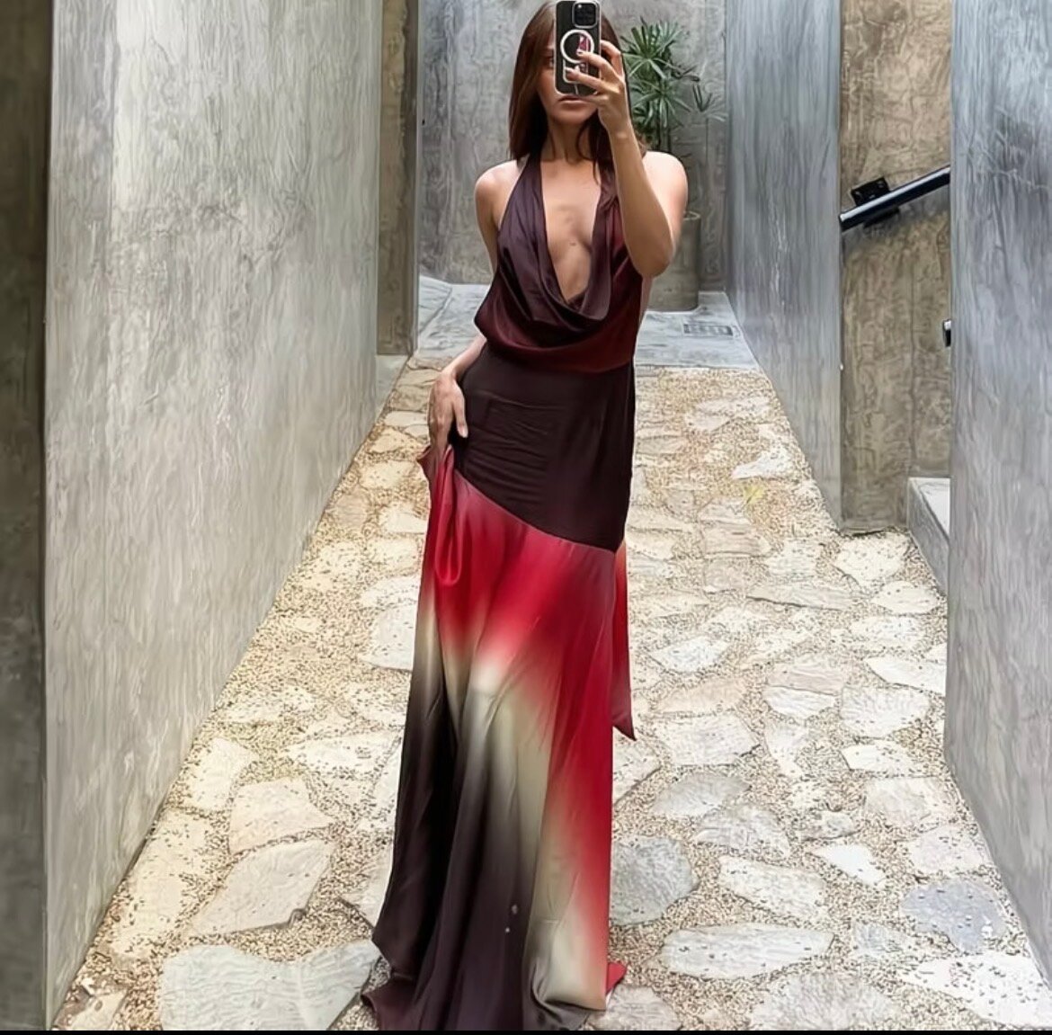 Cette robe longue dégradée est l'incarnation de l'élégance et du style. Avec son effet dégradé captivant de rouge à blanc, elle est idéale pour les occasions spéciales et les soirées. Le décolleté plongeant ajoute une touche de glamour, tandis que le tissu fluide assure un confort optimal. Portez-la avec des accessoires minimalistes pour un look sophistiqué et inoubliable. Parfaite pour les mariages, les galas ou une soirée romantique.