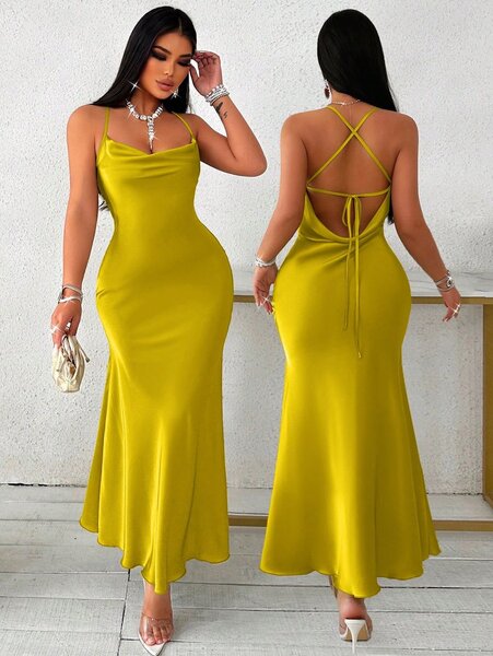 Élégante robe longue jaune avec dos nu, idéale pour des soirées spectaculaires et des événements chics. Sa coupe cintrée souligne la silhouette, offrant à la fois style et confort. Parfaite pour briller lors des occasions spéciales.