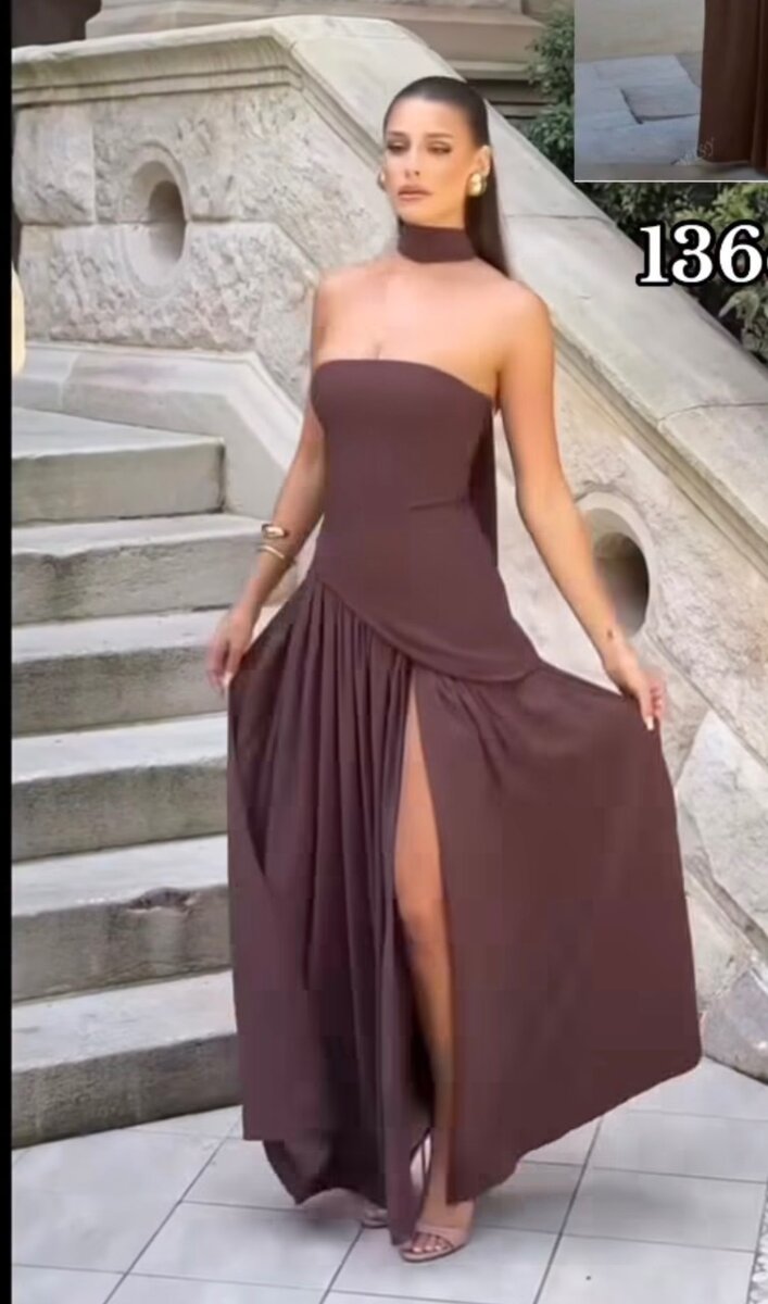 Découvrez cette superbe robe longue marron avec un col haut stylé et une fente séduisante. Idéale pour les soirées et événements, elle allie sophistication et confort. Parfaite pour sublimer votre silhouette avec élégance.