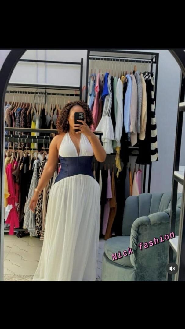 Découvrez cette robe longue élégante, parfaite pour les occasions spéciales. Conçue en bleu et blanc, elle offre un décolleté flatteur et une silhouette féminine. Idéale pour des soirées ou des événements formels.