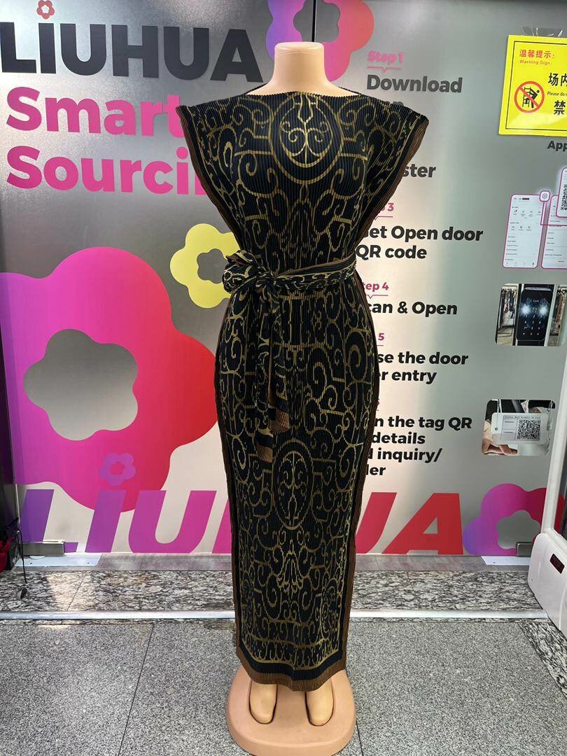 Élégante robe longue aux motifs dorés pour femme, parfaite pour des occasions spéciales. Conçue pour allier confort et style.