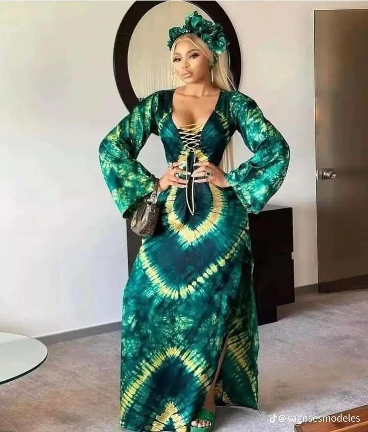 Optez pour cette élégante robe longue en tie-dye verte et jaune, parfaite pour des occasions spéciales. Avec ses manches longues évasées et son décolleté original, elle allie confort et style. Idéale pour un look unique et captivant.