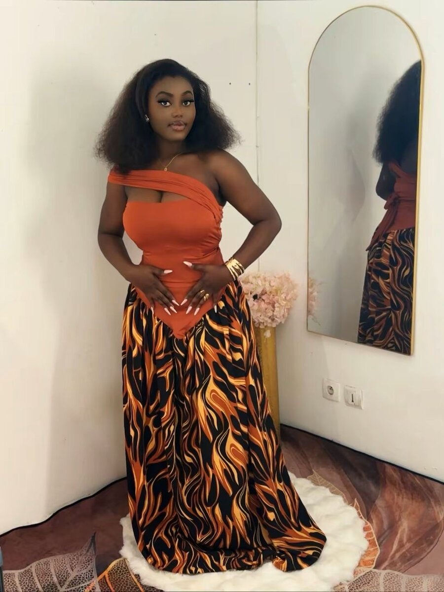 Découvrez cette robe longue évasée, parfaite pour une allure élégante et audacieuse. Son motif flamboyant et sa coupe asymétrique ajoutent une touche chic et moderne. Idéale pour soirées et événements spéciaux. Confort et style garantis.