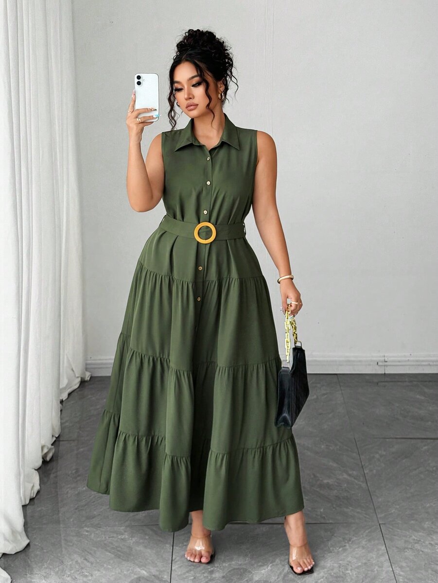 Cette élégante robe longue évasée verte est idéale pour toutes les occasions. Avec sa taille ceinturée accentuée par une boucle dorée, elle offre une silhouette flatteuse. Parfaite pour les soirées d'été ou un look décontracté mais sophistiqué, elle conviendra à toutes vos sorties.