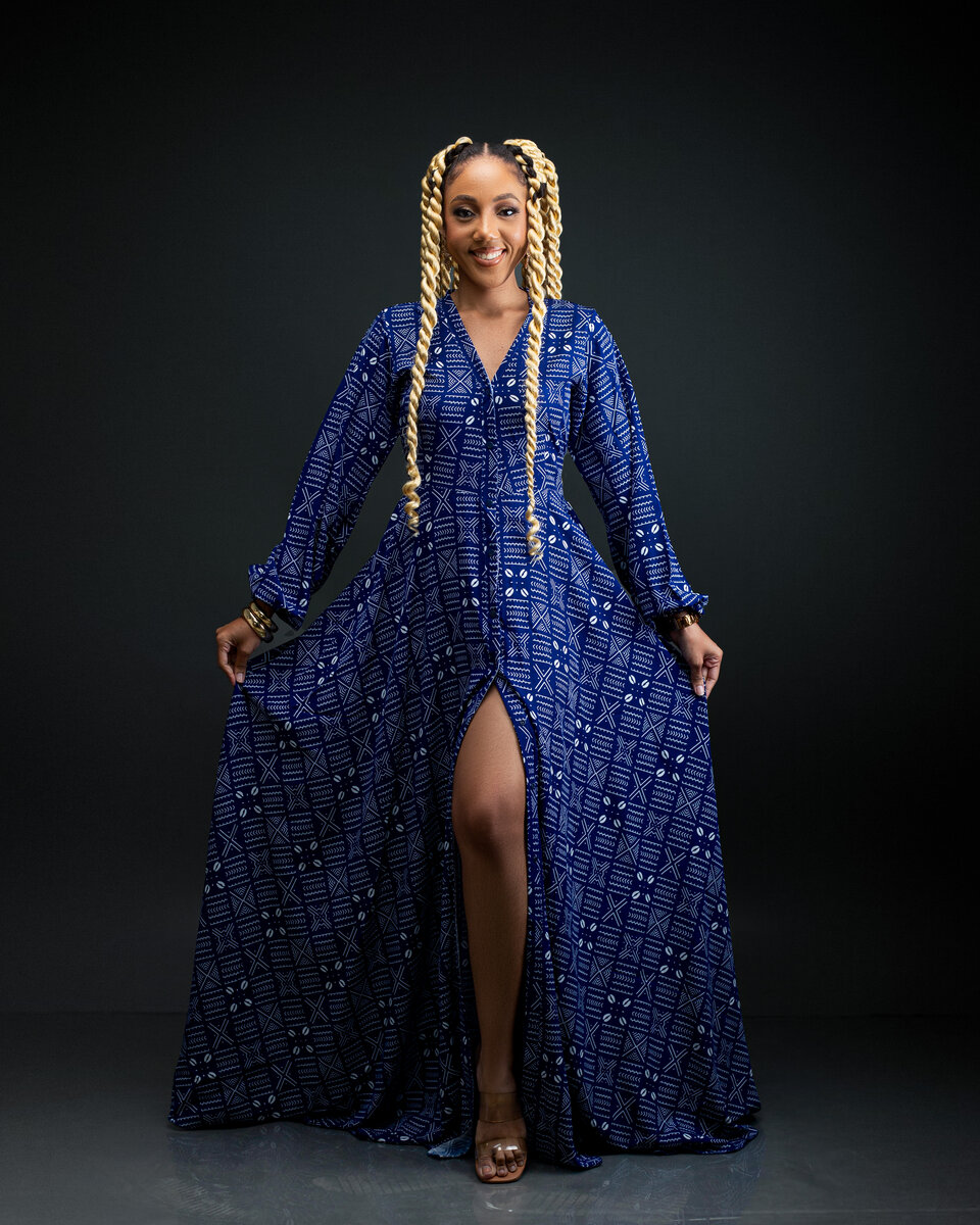 Élégante robe longue avec un motif géométrique unique, parfaite pour des occasions spéciales ou une tenue quotidienne chic. Tissu léger et confortable pour un look sophistiqué et moderne.