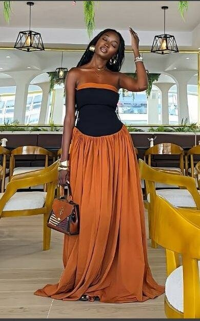Découvrez cette robe longue sans bretelles, parfaite pour les occasions spéciales. Confortable et élégante, elle combine un haut noir avec une jupe orange fluide.