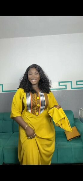 Robe longue pagne jaune moutarde à bustier rayé. Tenue élégante et pratique pour toutes occasions. Article neuf.