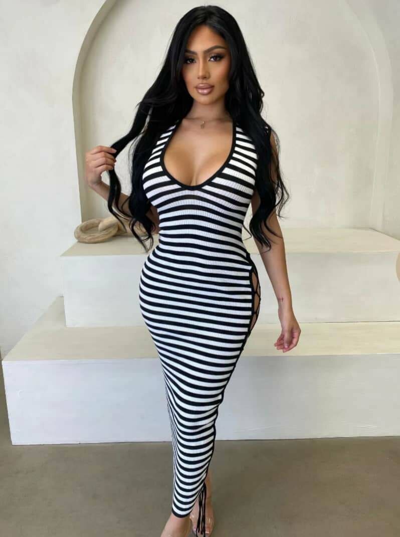 Découvrez l'élégance avec cette robe longue rayée noire et blanche. Conçue avec une fente audacieuse sur le côté, elle est idéale pour une soirée glamour ou un événement estival. Fabriquée avec des matériaux de haute qualité pour un confort optimal et une coupe flatteuse. Parfaite pour montrer votre sens du style unique.