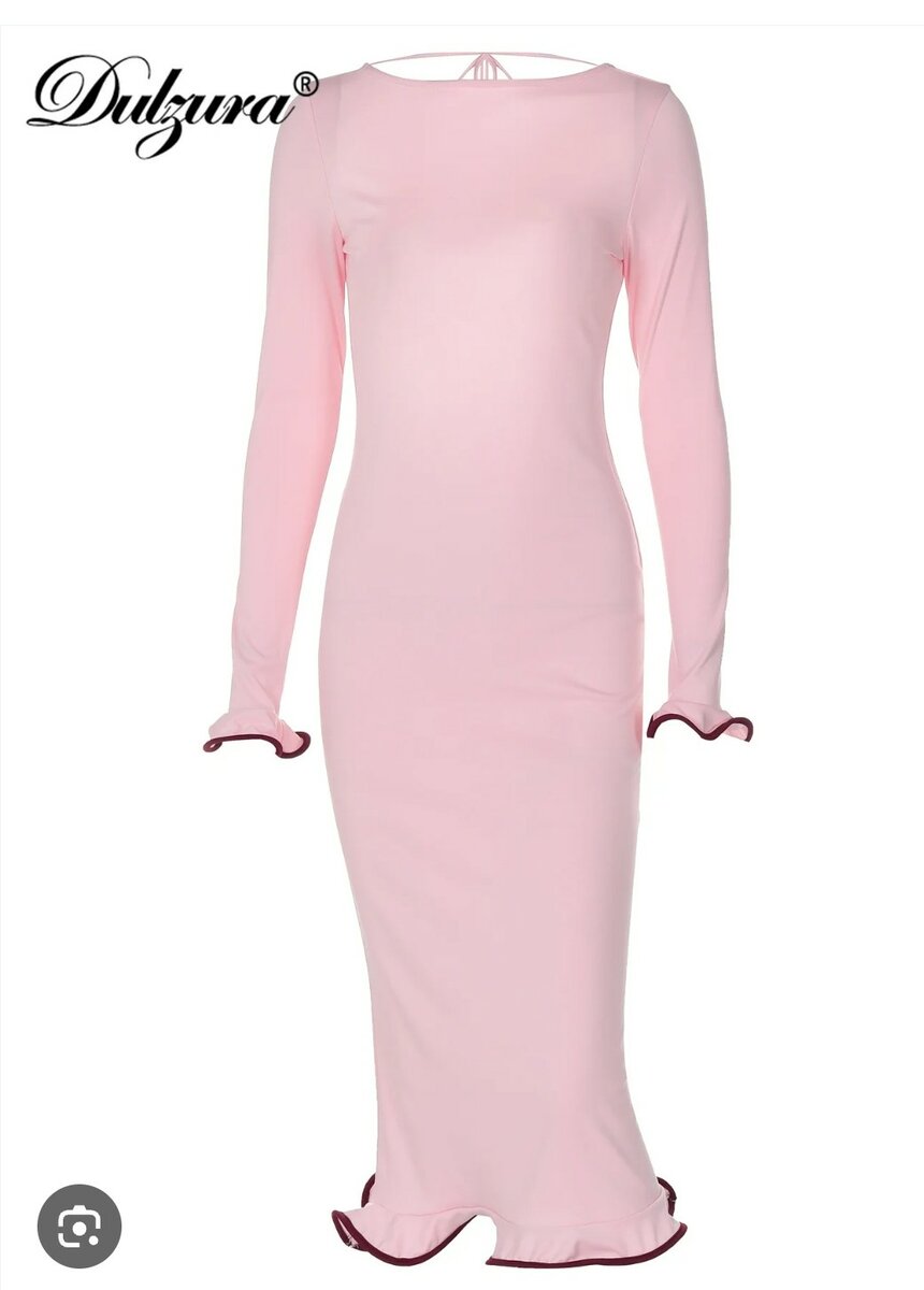 Découvrez cette robe longue rose au style raffiné, parfaite pour les occasions spéciales ou les soirées. Conception ajustée avec des manches longues et des détails ondulés aux poignets et à l'ourlet. Un choix chic pour une allure féminine et élégante, qui se démarquera à coup sûr.
