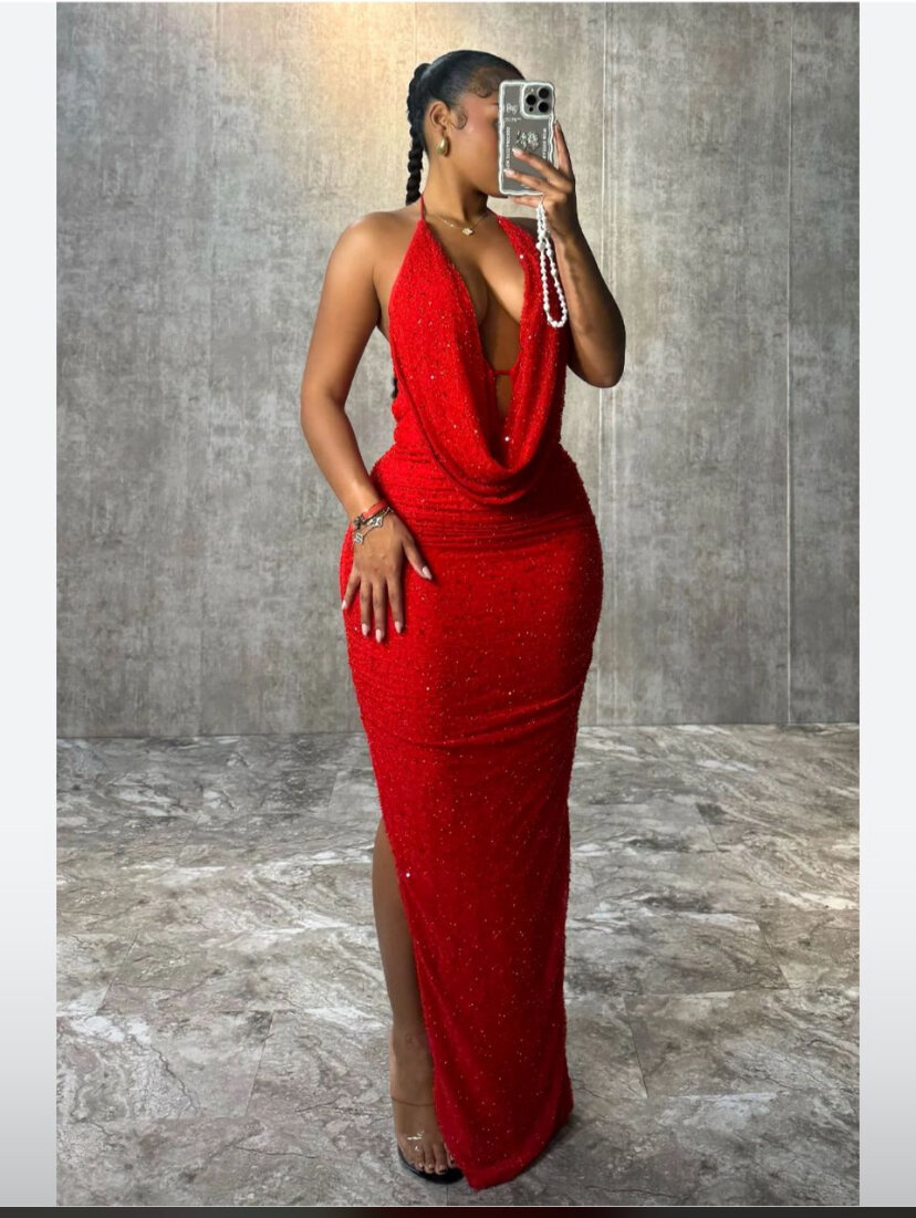 Éblouissante robe longue rouge avec encolure plongeante, idéale pour soirées élégantes. Confection haut de gamme, coupée pour flatter la silhouette.