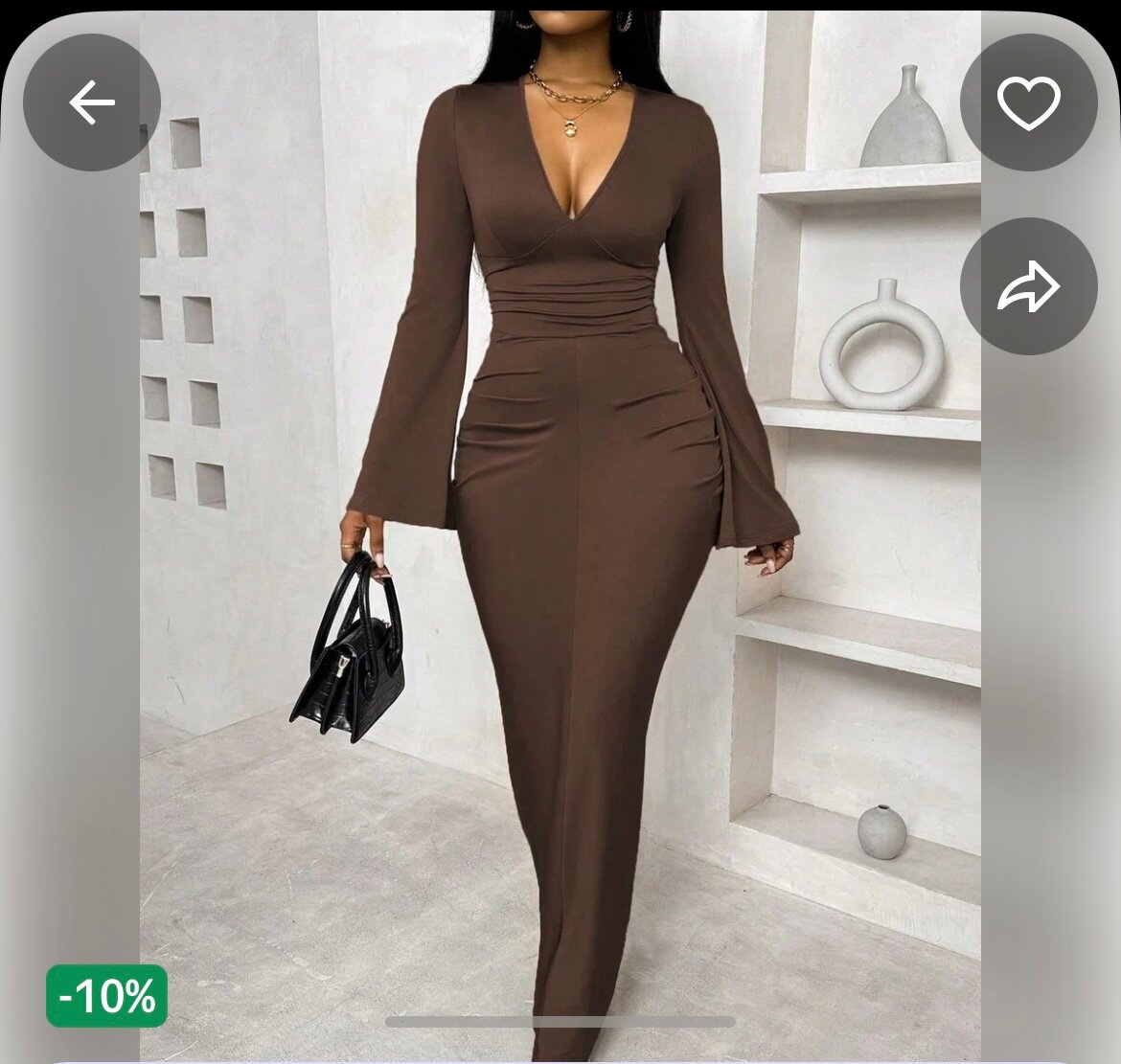 Robe marron à col en V profond pour femme, idéale pour une soirée élégante ou un rendez-vous.
