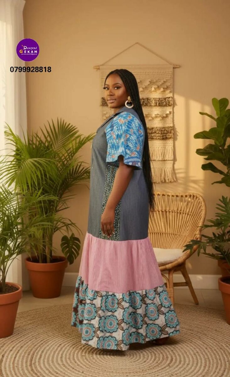Découvrez notre robe maxi bohème avec un mélange unique de Pagne WOODIN et JEANS Parfaite pour une allure décontractée ou une sortie spéciale. Fabriquée avec des matériaux de qualité pour un confort optimal. Un must-have pour votre garde-robe!