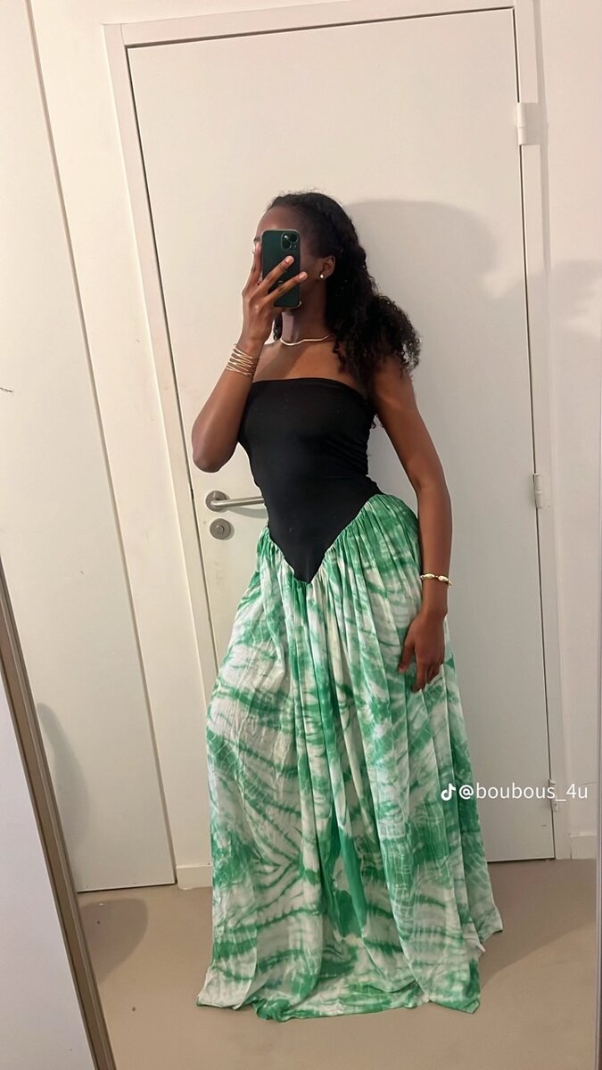 Élégante robe maxi évasée avec jupe verte et haut noir. Idéale pour les occasions estivales ou les sorties décontractées. Tissu léger et confortable, s'ajustant parfaitement à la silhouette pour un look chic et aérien. Parfaite pour se démarquer avec style.