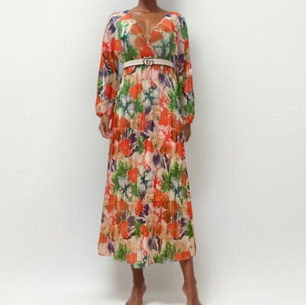 Élégante robe maxi avec imprimé floral vif. Tissu doux et fluide idéal pour les journées ensoleillées ou les événements spéciaux. Se porte avec des sandales pour un look décontracté ou des talons pour une allure sophistiquée. Parfaite pour le printemps et l'été.