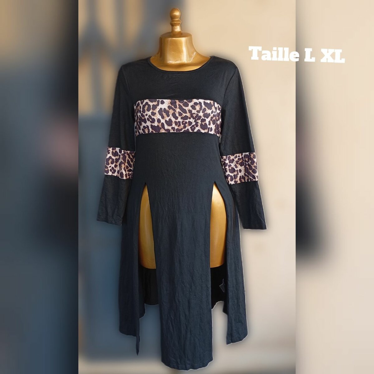 Élégante robe noire avec des détails léopard pour un look audacieux. Comprend des fentes avant pour un style moderne. Taille L à XL, idéale pour une soirée ou un événement spécial.