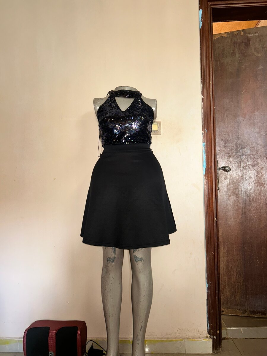 Optez pour cette robe noire élégante avec un haut parsemé de paillettes brillantes dos nue. Parfaite pour une soirée chic ou un événement spécial, cette robe allie confort et style. Facile à assortir avec vos accessoires préférés, elle sera votre alliée mode. Disponible en différentes tailles pour un ajustement parfait.