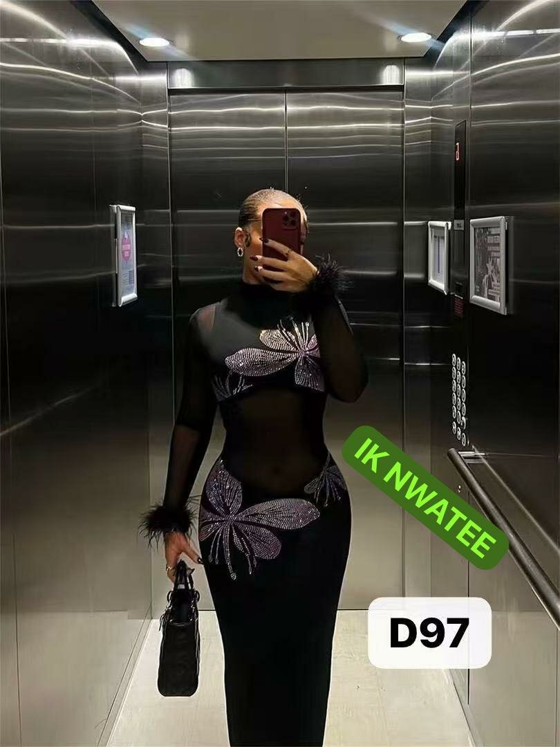 Cette robe noire élégante et transparente est ornée de détails scintillants en forme de papillons. Idéale pour les soirées spéciales, sa coupe flatteuse et sophistiquée vous fera briller et sortir du lot. Parfaite pour une soirée chic ou un événement glamour.
