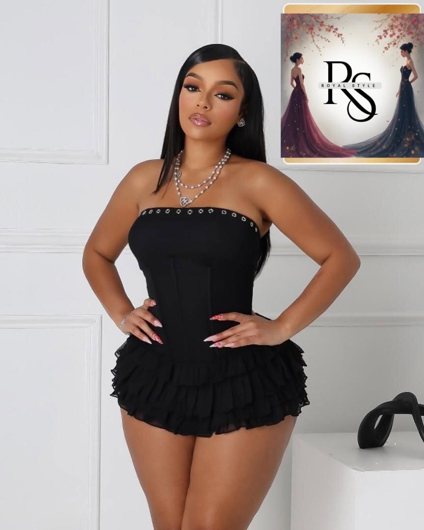 Élégante robe noire bustier avec volants, parfaite pour un look chic et glamour. Conçue pour la femme moderne, elle offre confort et style pour vos soirées et événements spéciaux.