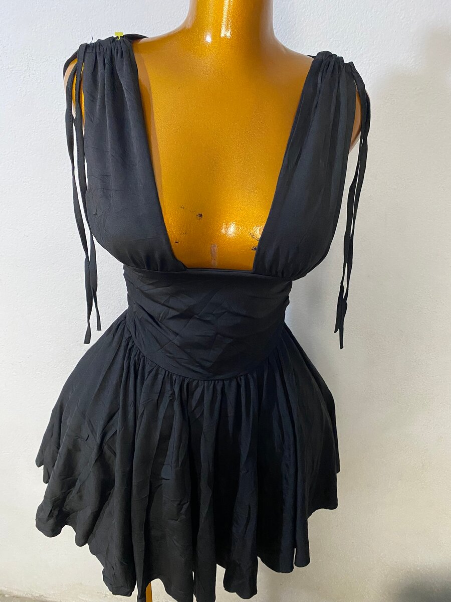 Découvrez cette élégante robe noire courte, parfaite pour les soirées ou les occasions spéciales. Conçue en tissu de coton léger et confortable, cette robe présente un décolleté plongeant et des bretelles à nouer sur les épaules. Sa jupe courte et évasée ajoute une touche féminine. Idéale pour les femmes cherchant une tenue chic et moderne.