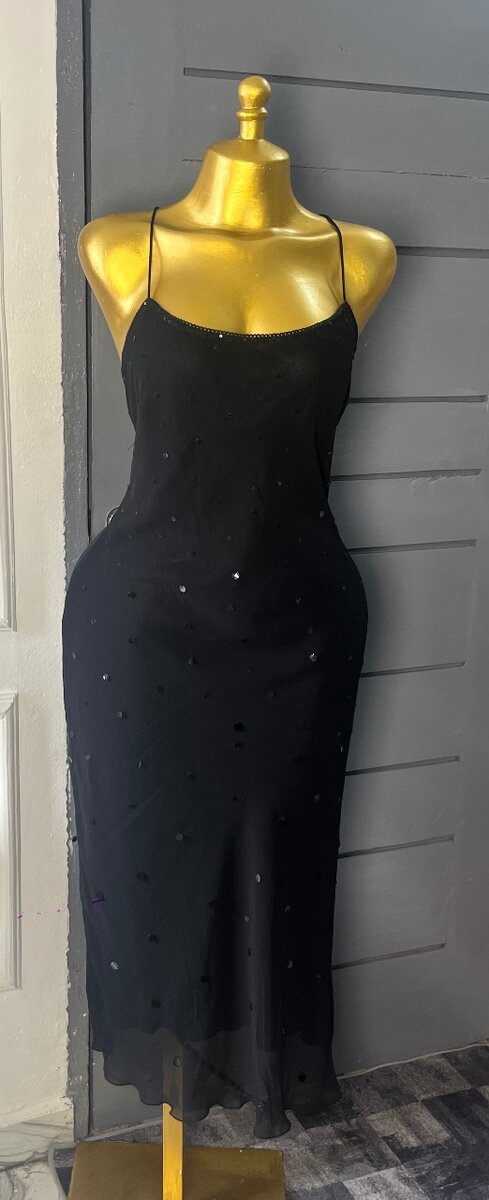 Cette robe noire à bretelles est idéale pour les soirées et les occasions spéciales. Avec sa silhouette flatteuse et son design sophistiqué, elle est confectionnée dans un tissu de haute qualité. Ajoutez une touche de glamour et d'élégance à votre garde-robe.