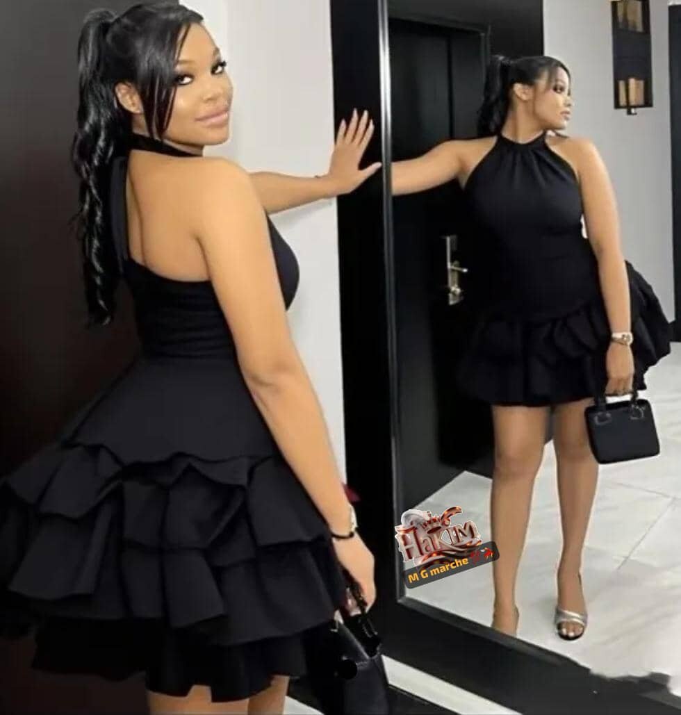 Robe noire chic avec volants pour soirées et événements spéciaux. Tissu confortable et design élégant. Idéale pour un look sophistiqué et séduisant. Portez-la avec des talons pour un style inoubliable.