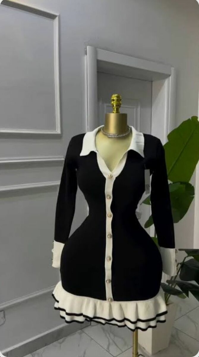 Cette robe noire avec des détails à volants blancs est l'incarnation de l'élégance moderne. Parfaite pour les occasions spéciales ou une soirée en ville, elle offre un confort et un style inégalés. Son design ajusté et ses boutons décoratifs ajoutent une touche chic et sophistiquée. Idéale pour affirmer votre look élégant et confiant. Ne manquez pas cette pièce incontournable pour votre garde-robe!