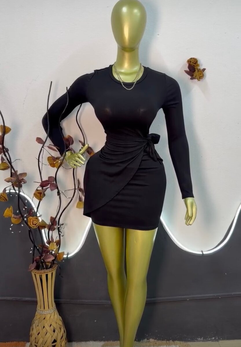 Découvrez cette robe noire chic à manches longues, parfaite pour toute occasion. Enroulée à la taille avec une jupe courte, elle allie style et confort. Idéale pour un look élégant et moderne.