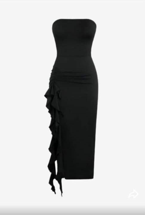 Robe noire élégante, parfaite pour les occasions spéciales. Conception ajustée avec détails de volants sur le côté.