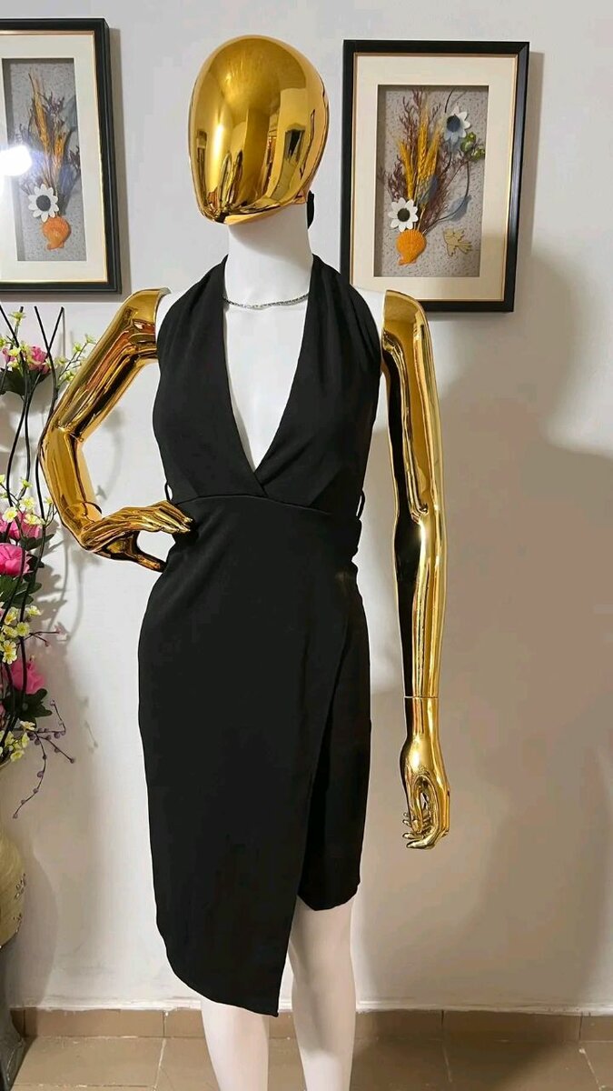 Cette robe noire est parfaite pour les occasions spéciales. Avec son design chic et son décolleté plongeant, elle accentue votre silhouette avec élégance. Idéale pour soirées ou événements importants.