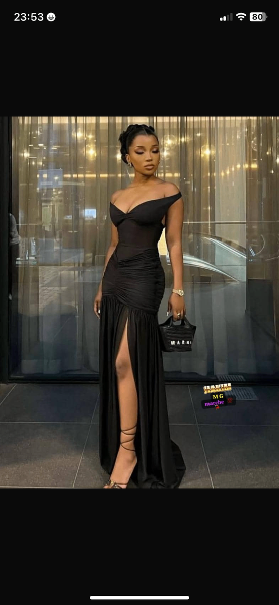 Élégante robe noire longue avec fente, parfaite pour soirées ou événements formels. Mettez en valeur votre silhouette avec son design épaule dénudée.